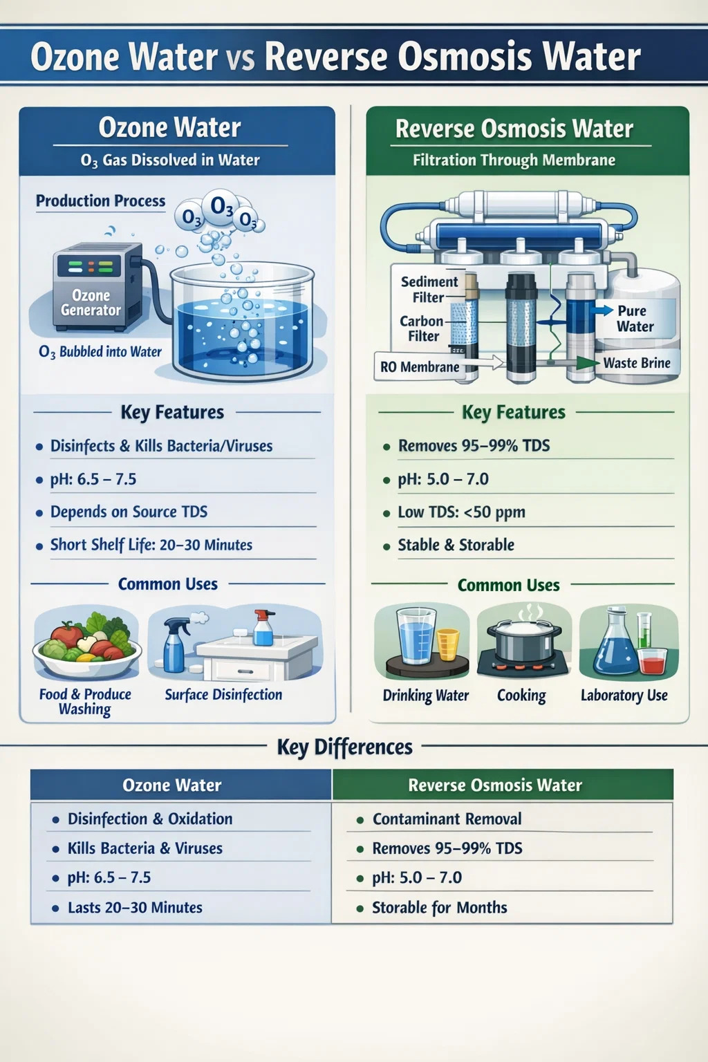 L'acqua di ozono e l'acqua di osmosi inversa non sono la stessa cosa e non sono intercambiabili. L'acqua ozonata è l'acqua utilizzata come disinfettante attivo; L'acqua RO è l'acqua da cui i contaminanti sono stati fisicamente rimossi. Il primo funziona attraverso la chimica: ossidazione e distruzione microbica. Il secondo funziona attraverso la fisica: filtrazione della pressione su scala molecolare.